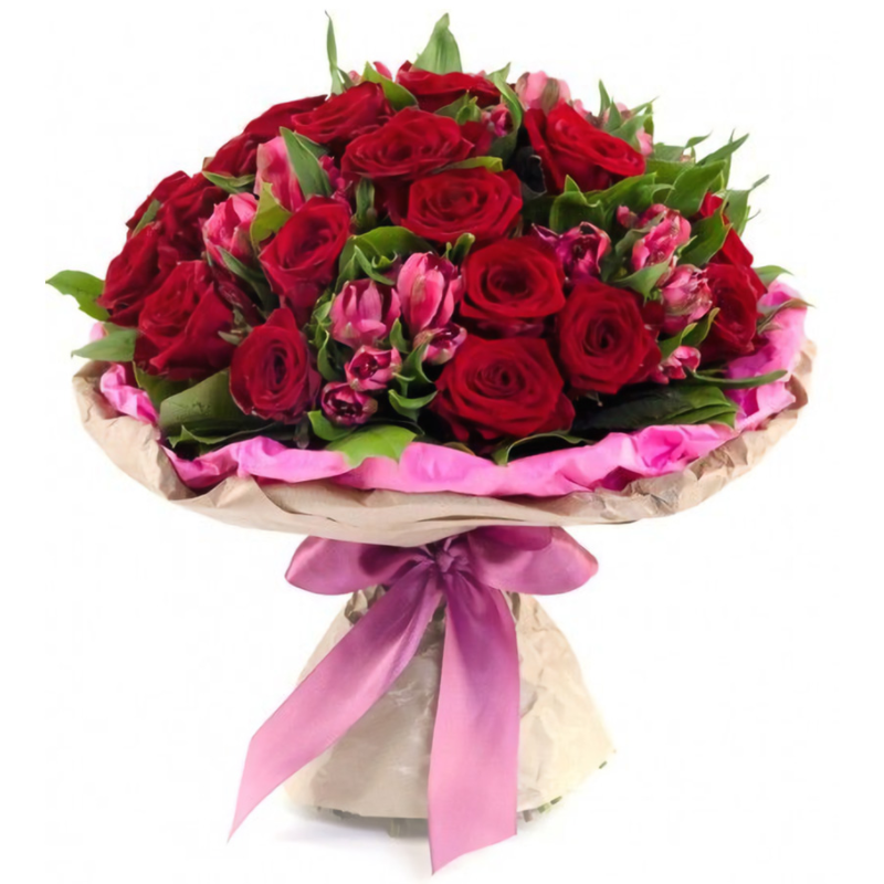 Букет состоит из 21 красная роза, 6 розовых альстромерий, зелень, крафт, атласная лента.