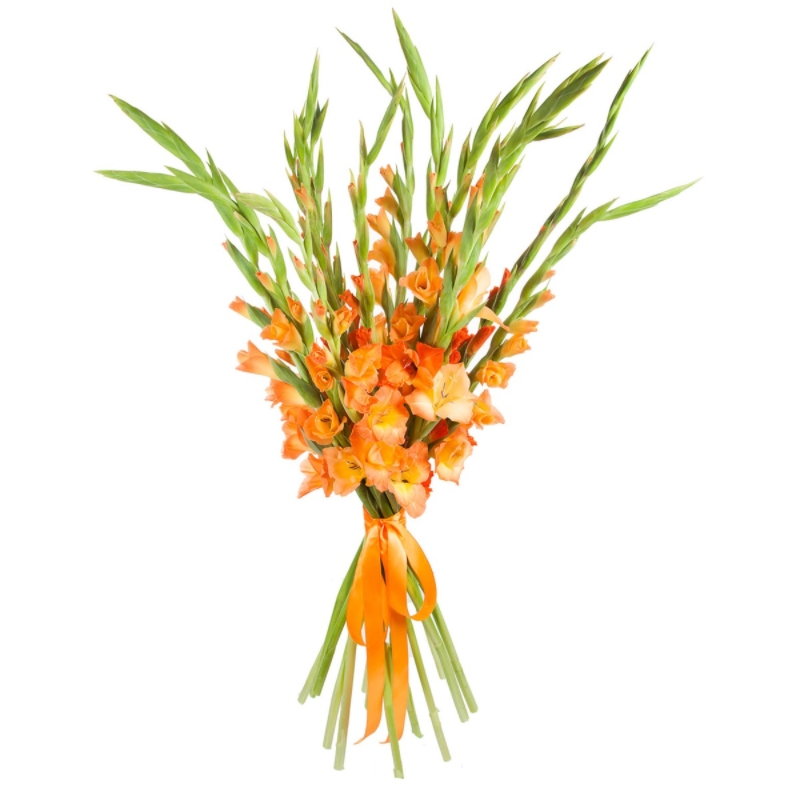 Букет состоит из 15 оранжевых гладиолусов, прозрачная упаковка, атласная лента.