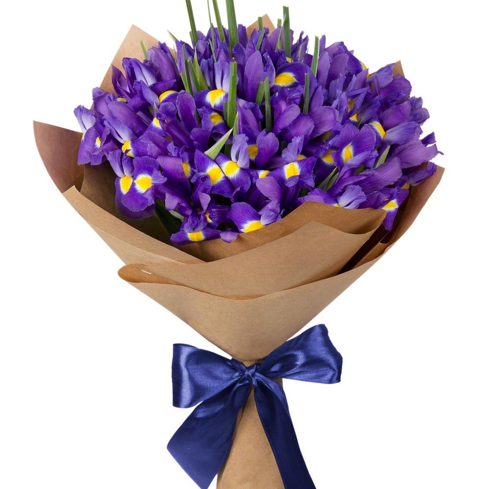 Букет состоит из 25 ирисов, упаковка, лента.