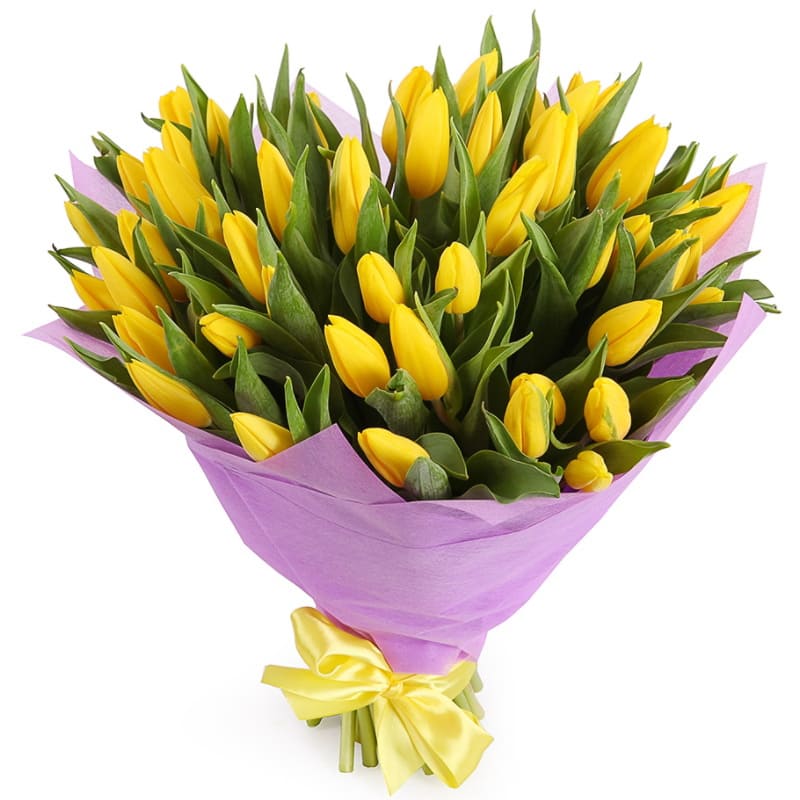 Букет состоит из 51 желтый тюльпан, красивая упаковка, атласная лента.