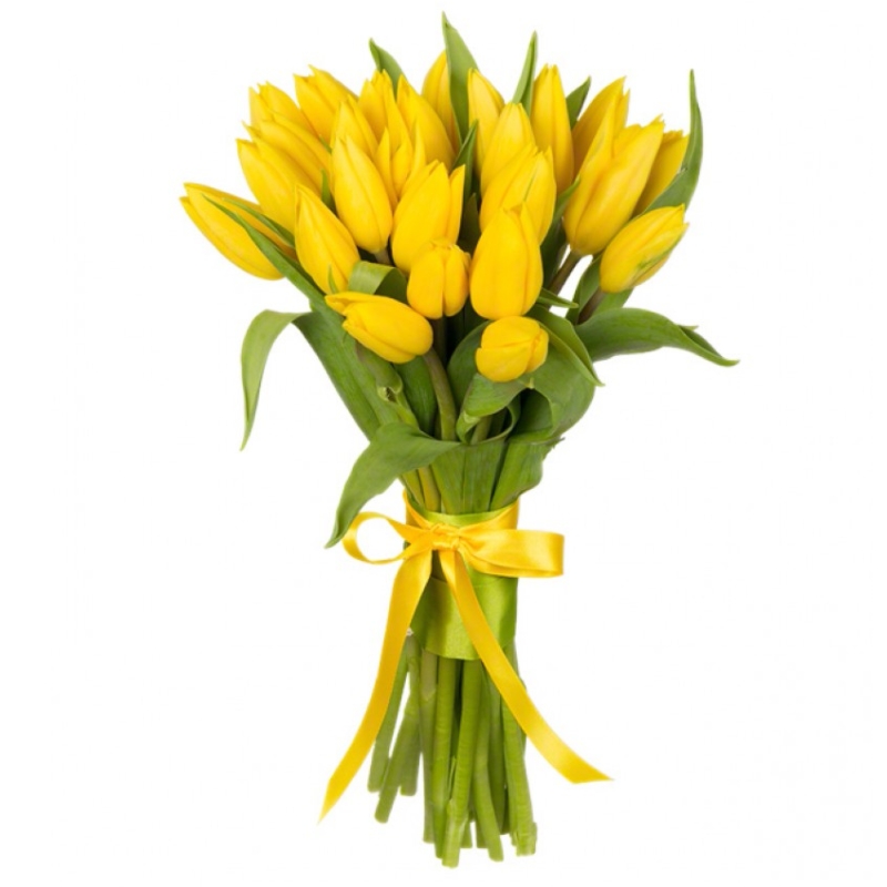 Букет состоит из 19 желтых тюльпанов, прозрачная упаковка, атласная лента.