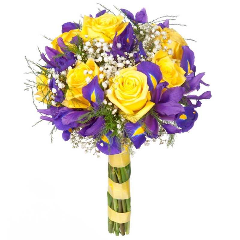 Букет состоит из 7 желтых роз, 11 ирисов, 1 ветка гипсофилы, зелень, лента.