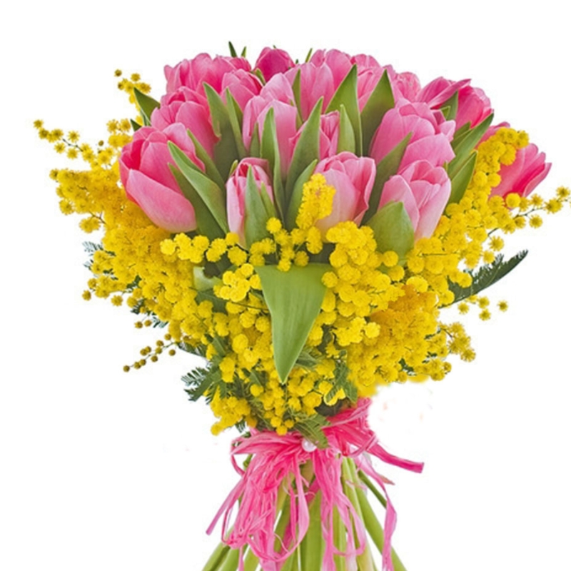 Букет состоит из 21 розовый тюльпан, 7 веток мимозы, прозрачная упаковка, атласная лента.