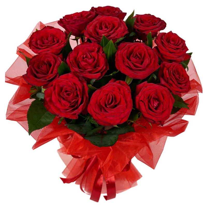Букет состоит из 17 красных роз, упаковка, лента.