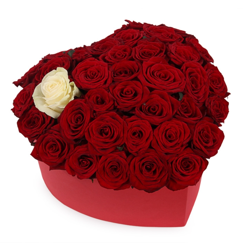 44 красные розы, 1 белая роза, коробка в виде сердца.